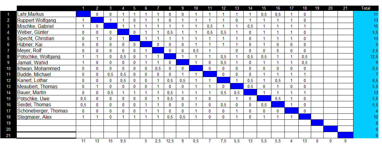 Am Ende setzt sich der eher unauffällig auftretende Neuzugang mit 15/17 Punkten an Platz 1, gefolgt von drei Spielern mit 13/17, welche Platz 2 dann im Stechen entscheiden durften. Hier behält der Vertreter von Schott Mainz das bessere Ende für sich.