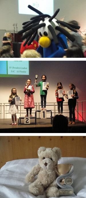 Doch wie heißt es so schön „jeder Anfang ist schwer“ insbesondere dann, wenn es sich um ein so gigantisches und bedeutsames Turnier handelt. Vor allem Paula hatte wie bei der Hessenmeisterschaft erhebliche Anlaufschwierigkeiten. Eine Mischung aus großer Aufgeregtheit in Verbindung mit der einen oder anderen Unaufmerksamkeit führte zum klassischen Fehlstart mit drei Niederlagen in den ersten drei Runden. Doch Paula`s Kämpferherz, ihre positive Einstellung und der ihres Trainers sowie die Erkenntnis aus der Analyse, dass sie durchaus auch Gewinnchancen ausließ, machten ihr Mut und der erste Sieg in Runde 4 sollte der Durchbruch im Turnier sein. Es folgten ein weiterer Sieg und ein Remis. In Runde 7 gab es wiederum eine Niederlage, doch es sollte die letzte im Turnier sein, denn danach folgte eine beeindruckende Aufholjagd, indem sie aus den letzten vier Runden 3,5 Punkte holte, immerhin gegen Gegner, die teilweise über 300 DWZ Punkte stärker waren !. Dieser tolle Endspurt sollte sich bezahlt machen. Denn bei der separaten Wertung der Mädchen zog sie mit dem letzten Sieg mit den Führenden mit jeweils 6 Punkten gleich, und die Spannung nach der letzten elften Runde hätte kaum größer sein können. Die Frage, wer Deutsche Meisterin der U10 wird musste die Feinwertung in Form der Buchholzzahl beantworten und Paula war unter den Kandidatinnen, was wohl kaum einer vor und während des Turniers für möglich gehalten hatte. Am Ende belegte sie punktgleich einen großartigen Platz 5 unter insgesamt 32 Mädchen in der U10 Altersklasse und als krönenden Abschluss durfte sie vor über 1000 Zuschauer bei der Siegerehrung auf die Bühne auf dem Siegertreppchen stehen !!