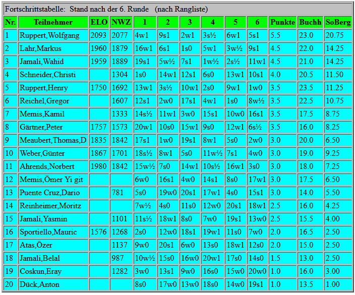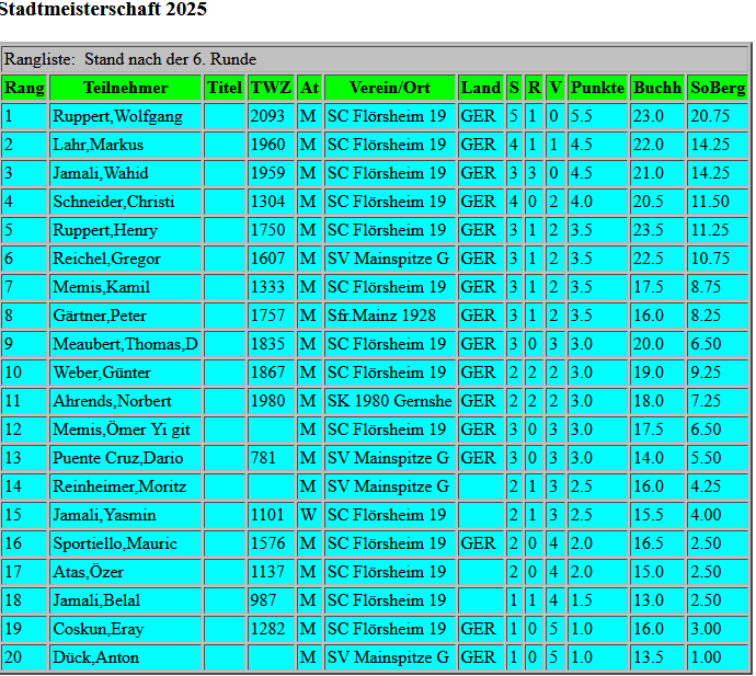 Modus: fünf bis sieben Runden Schweizer System, abhängig von der Teilnehmerzahl